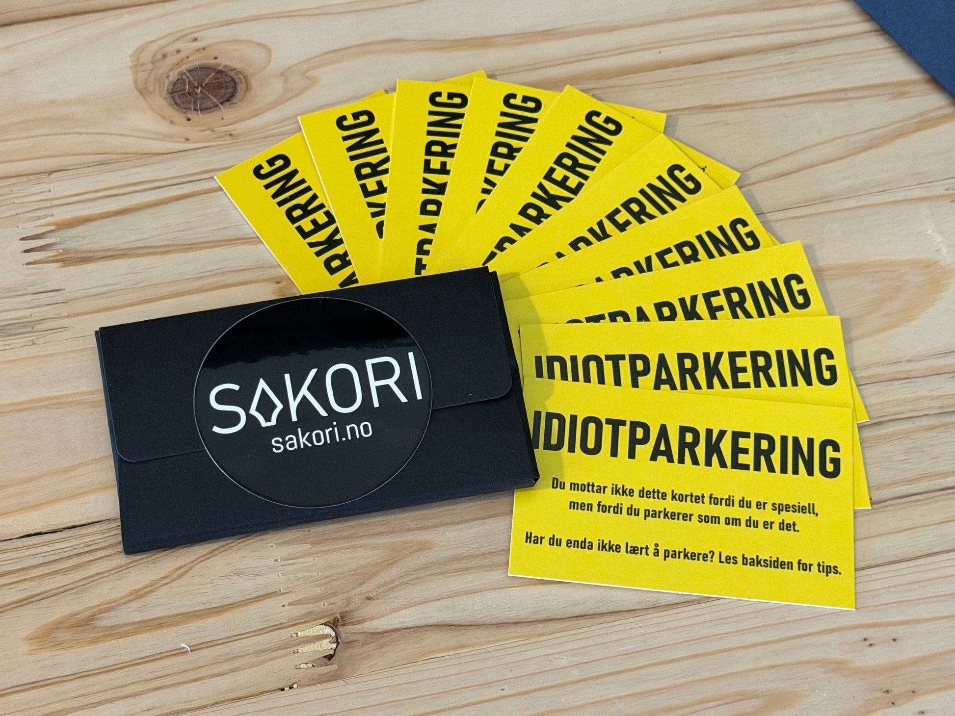 Her har du en pakke med 10 kort med "IDIOTPARKERING" som ligner litt på en klassisk parkeringsbot. Så du kan gi litt høy puls til idiotparkerere.