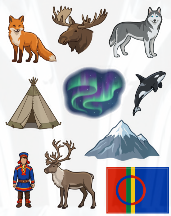 Figurskårne klistremerker av rev, elg, husky, lavvo, nordlys, spekkhogger, fjell, mann i gákti, reinsdyr og samisk flagg